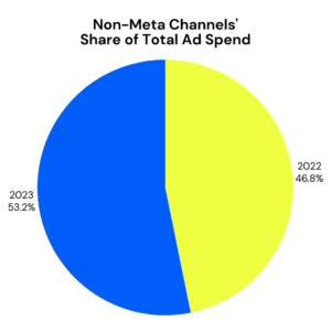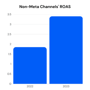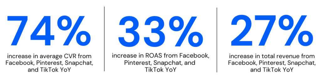 Brands strategically diversified their social channel presence, moving away from heavy reliance on Meta platforms like Facebook and Instagram. Non-Meta channels experienced an 84% improvement in Return on Ad Spend (ROAS) with a 14% increase in investment. Notably, Pinterest stood out with a remarkable 149% YoY increase in investment and a 79% revenue boost.