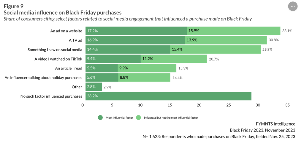 Over 14% of consumers noted that an influencer talking about holiday purchases influenced their Black Friday purchases this year, with around 6% saying it was the most important influence on their Black Friday purchasing decision — underscoring the importance (and well, influence) of incorporating influencer marketing into your overall marketing strategy especially during peak shopping periods.