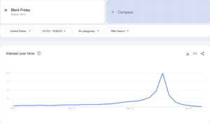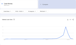A trend that was not surprising but rather predictable was the significant surge in search activity related to terms like ‘Black Friday,’ ‘Cyber Monday,’ and ‘holiday sales.’ Brands that designed dedicated web pages exclusively tailored to these terms had a one-up in capturing this heightened traffic.